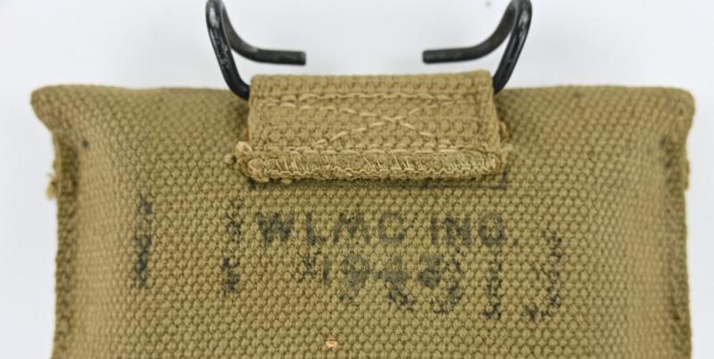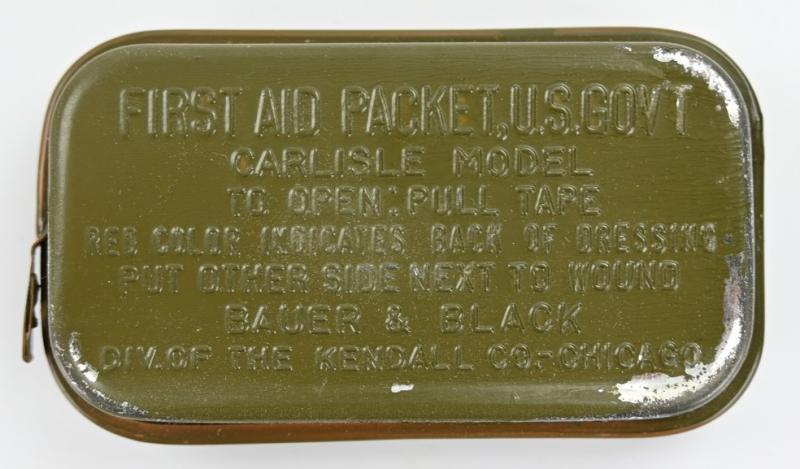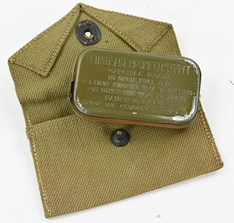 The pouch has the khaki colour, is maker marked and 1943 dated and comes with a carlisle model first aid dressing on the inside!