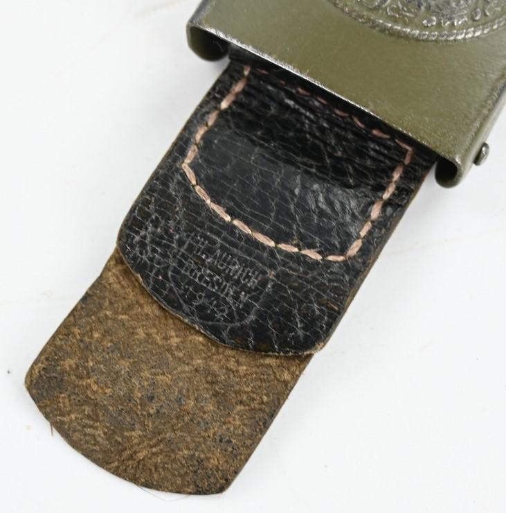 The late war steel beltbuckle is marker marked Heinrich Aurich from Dresden on the leather tab.