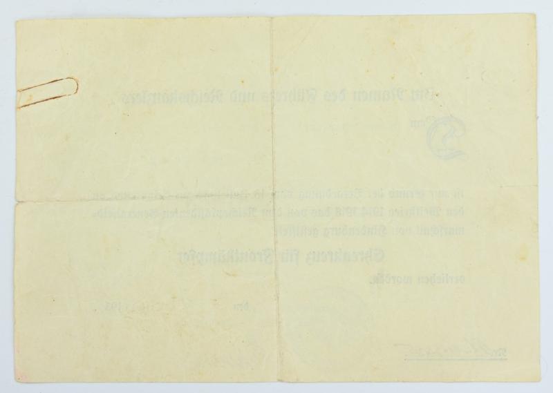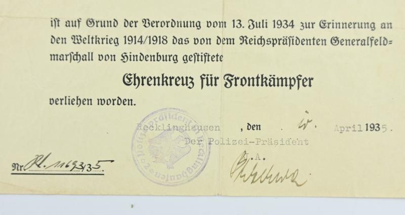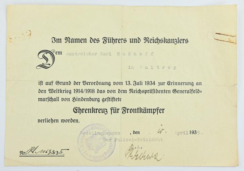 In a very good condition a German Hindenburg Cross with Certificate. The certificate is nicely named and dated 1935.