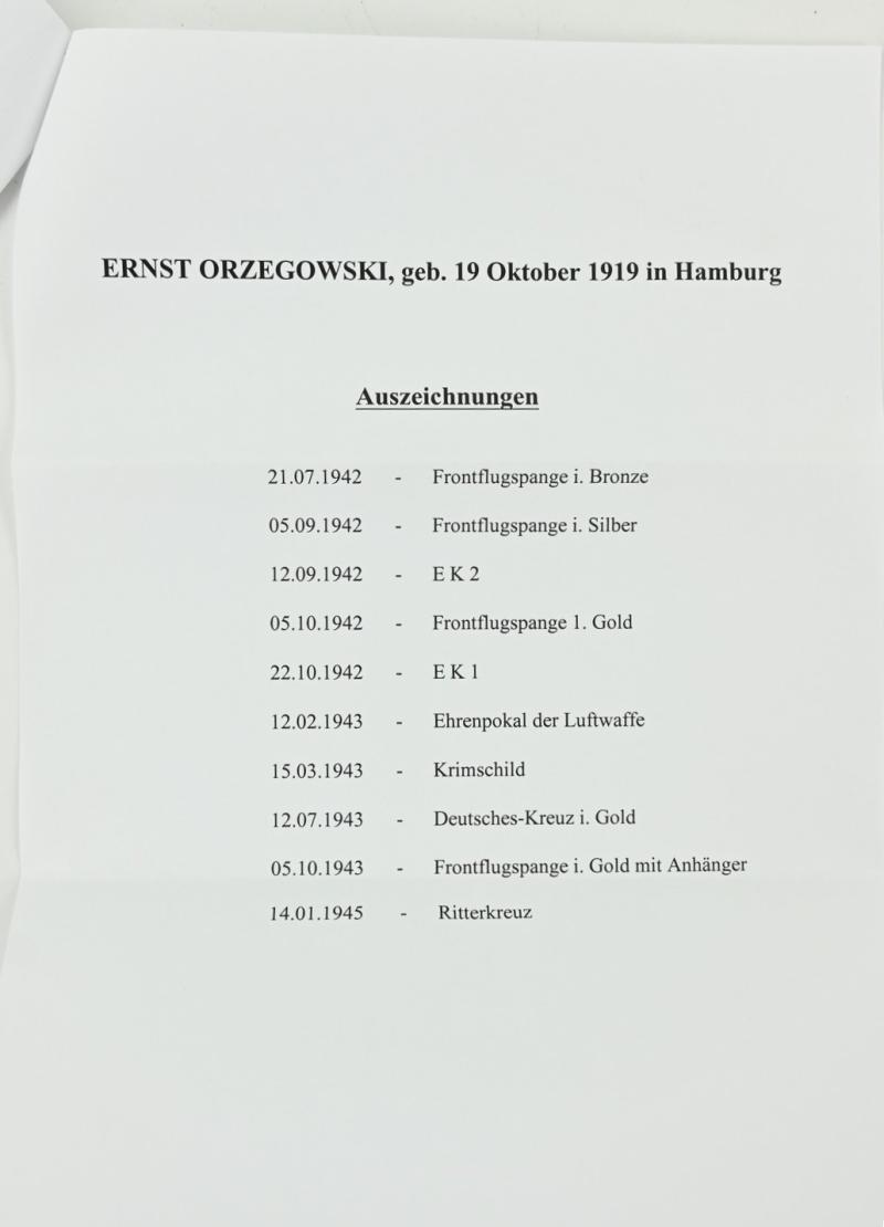 Fahnenjunker-Feldwebel Ernst Orzegowski earned the German Cross in Gold on July 12, 1943 as Unteroffizier in the 4. Staffel/ Stukageschwader 77 and the Knight's Cross of the Iron Cross on January 14, 1945 as Fahnenjunker-Feldwebel in the 7. Staffel/ Schlachtgeschwader 10.