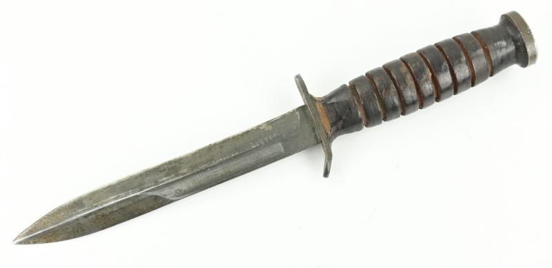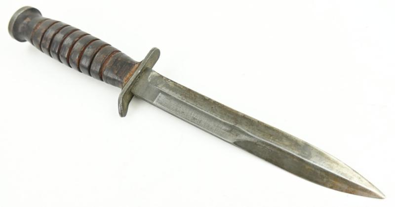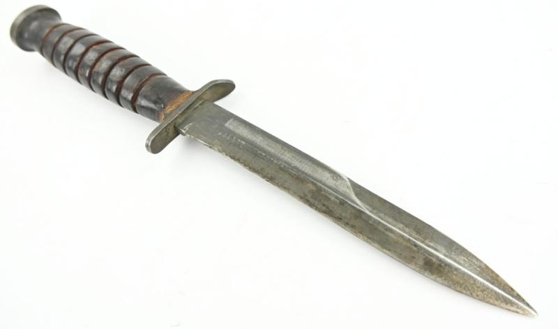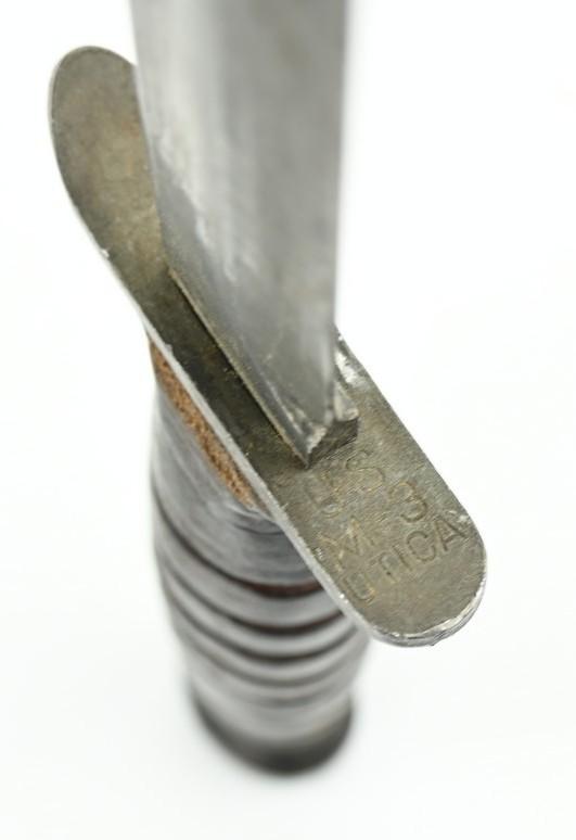 In a very nice condition a US WW2 M3 Fighting Knife. The knife is nicely maker marked on the crossguard by 'Utica' and has the flaming bomb on top of the knife. A very nice example.