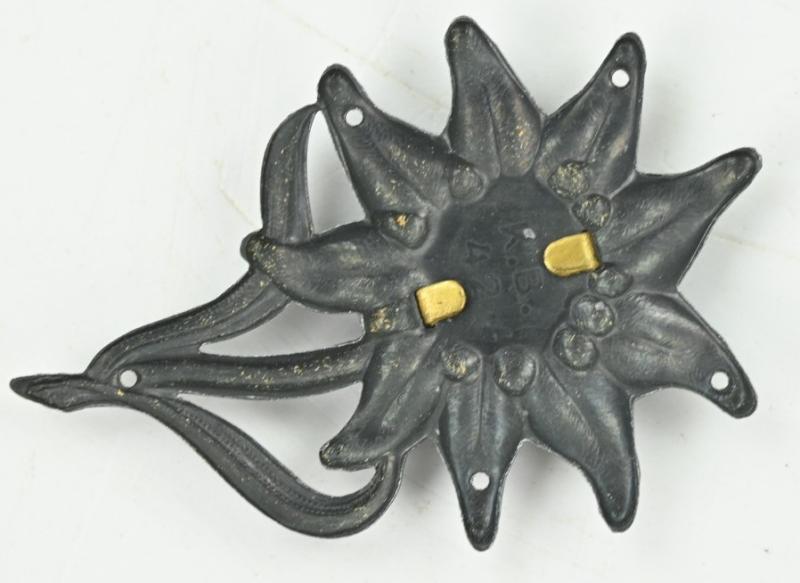 In a very good condition a german Wehrmacht 'Edelweiss' Mountain troops (Gebirgsjäger) Cap Badge. The badge is maker marked and dated 1942.