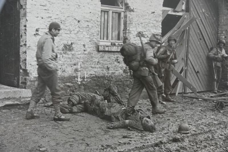 On the picture are US soldiers walking over German bodies on there advantage to the next location.