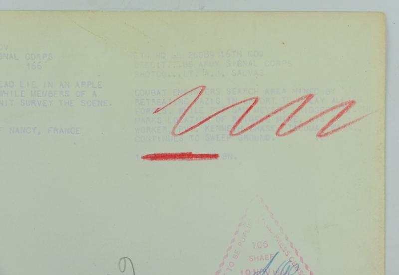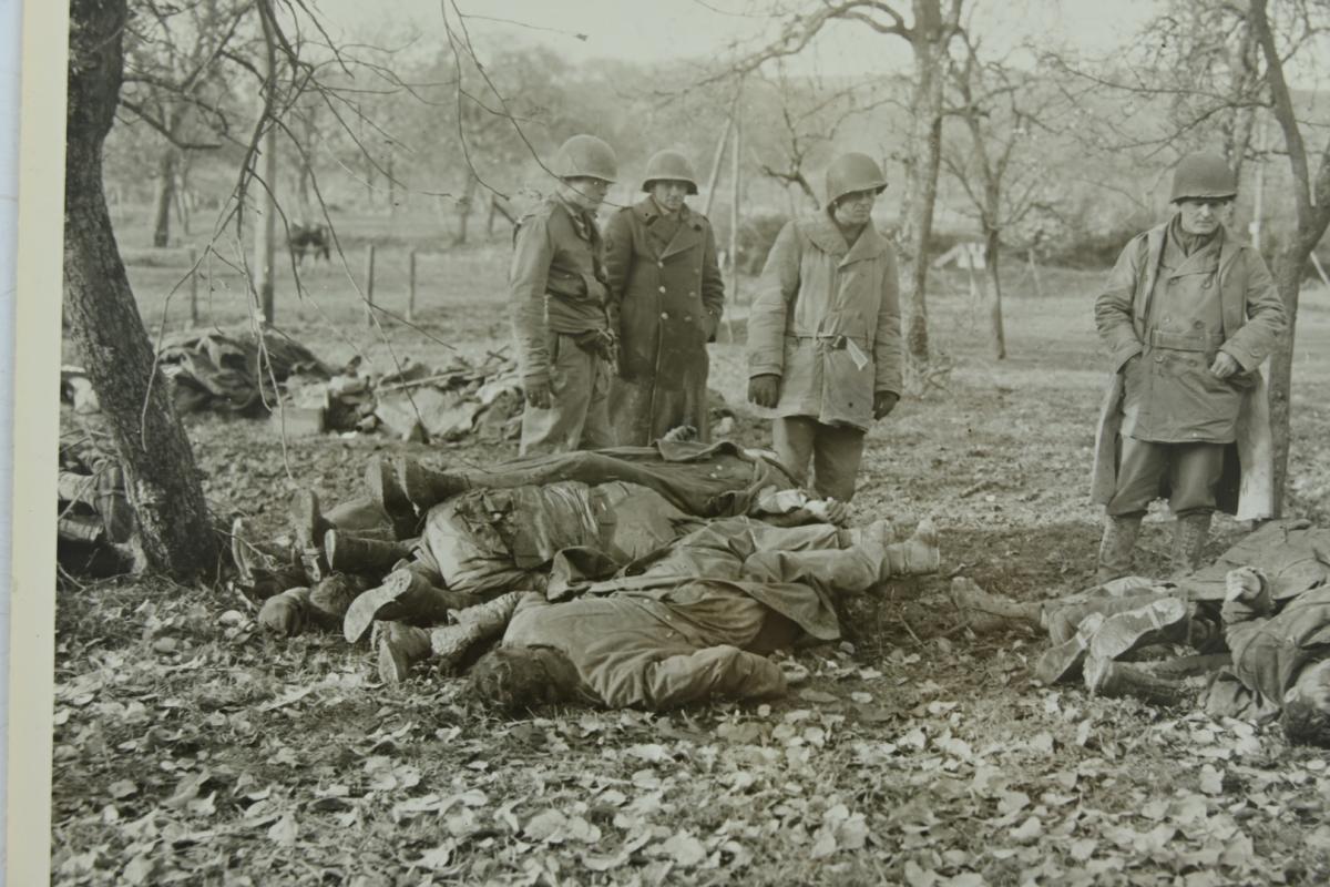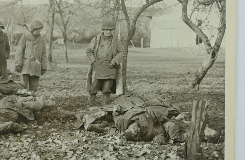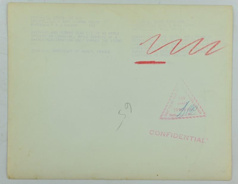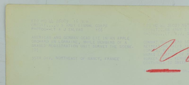 In a very nice condition a US WW2 Press Photo of dead german and american soldiers lined up in a Apple Orchard near Nancy France. The picture comes in a size of approx 20x25cm.