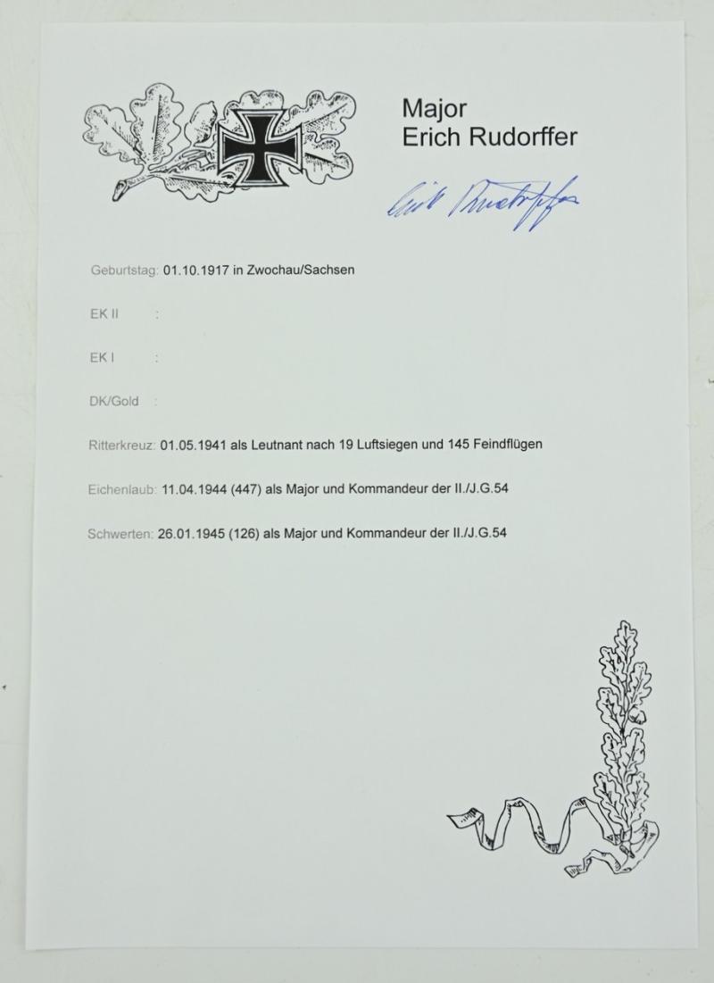 Major Erich Rudorffer earned the German Cross in Gold on December 9, 1941 as Leutnant und Flugzeugführer in the 6. Staffel/ Jagdgeschwader 2 “Richthofen”, the Knight's Cross of the Iron Cross on May 1, 1941 as Leutnant und Flugzeugführer in the 6. Staffel/ Jagdgeschwader 2 “Richthofen”, the Oakleaves on April 11, 1944 as Major und Kommandeur of the II. Gruppe/ Jagdgeschwader 54 “Grünherz” and the Swords on January 26, 1945 as Major und Kommandeur of the II. Gruppe/ Jagdgeschwader 54 “Grünherz”.