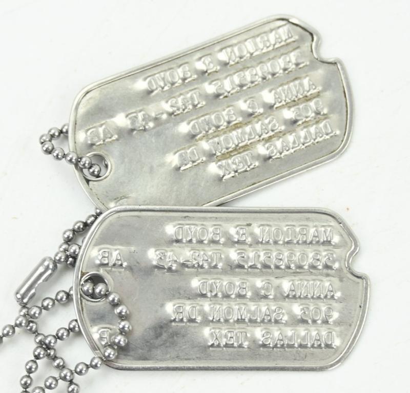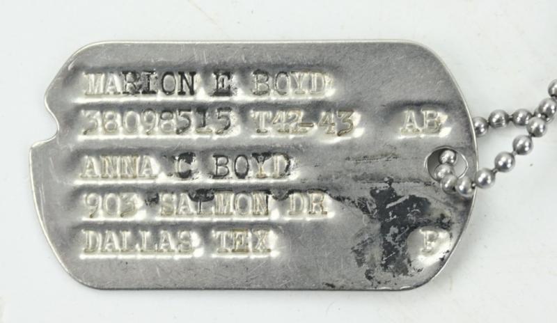 In a very good condition a US WW2 Dog-Tag Set on the name of 'Marion E. Boyd'. The dog-tag set comes in the first pattern.