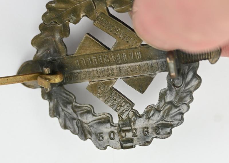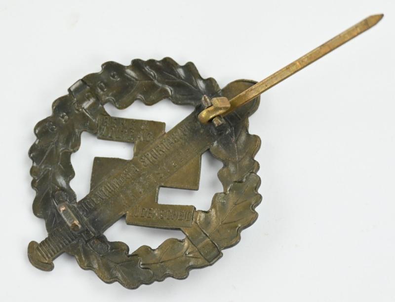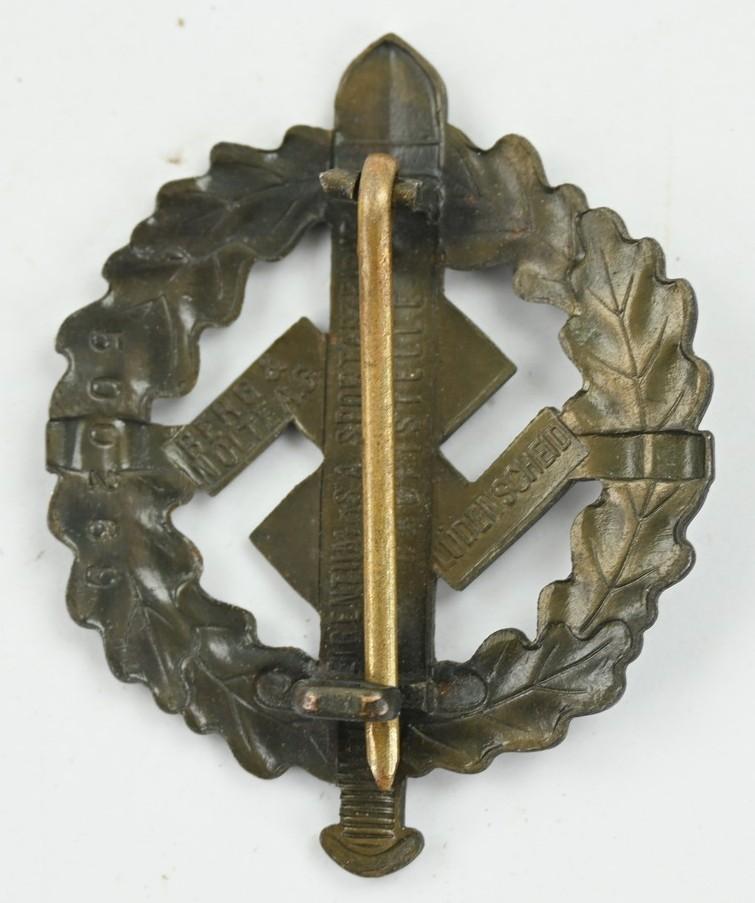 In a very good condition a German SA (Sturmabteilung) Sports Badge in Bronze. The badge comes with it's original finish on front and back and has a functional needle and catch.