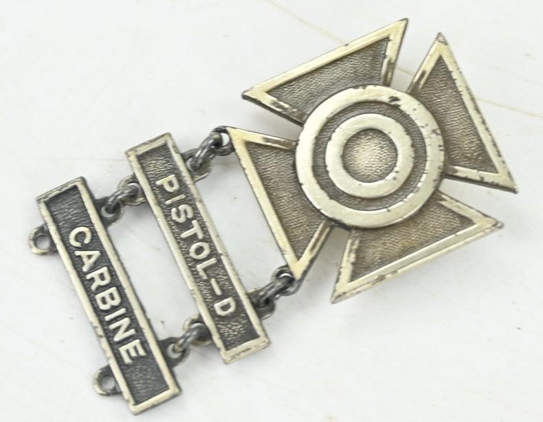 In a very nice condition a US WW2 Sterling Silver Marksman Sharpshooter Badge. The badge comes with teh Pistol-D and Carbine qualification bars attached.
