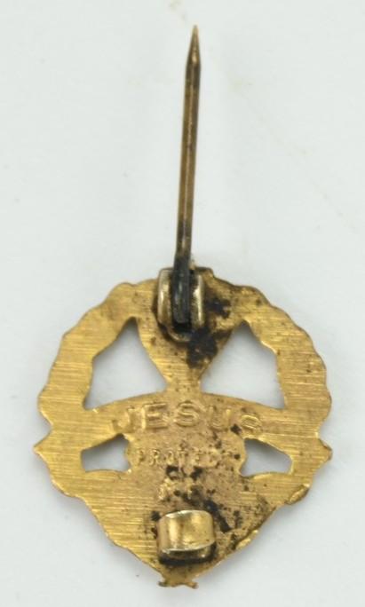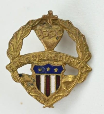 In a very nice condition a US WW2 Patriotic Lapel Pin 'For god and Country'. The pin is marked on the reverse side with Jesus Protect. A very nice gilt lapel pin from ww2 with a size of approx 20mm heigh.