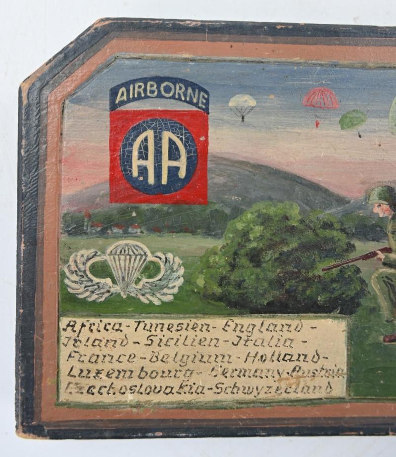 The sign comes in a size of approx 30x15cm and is on one side very stunning painted with airborne troops jumping out of an airplane and has the name of FLoyd Dove of the 504th Parachute Infantry Regiment named as a member of the 1st battalion in Occupated Berlin Germany.