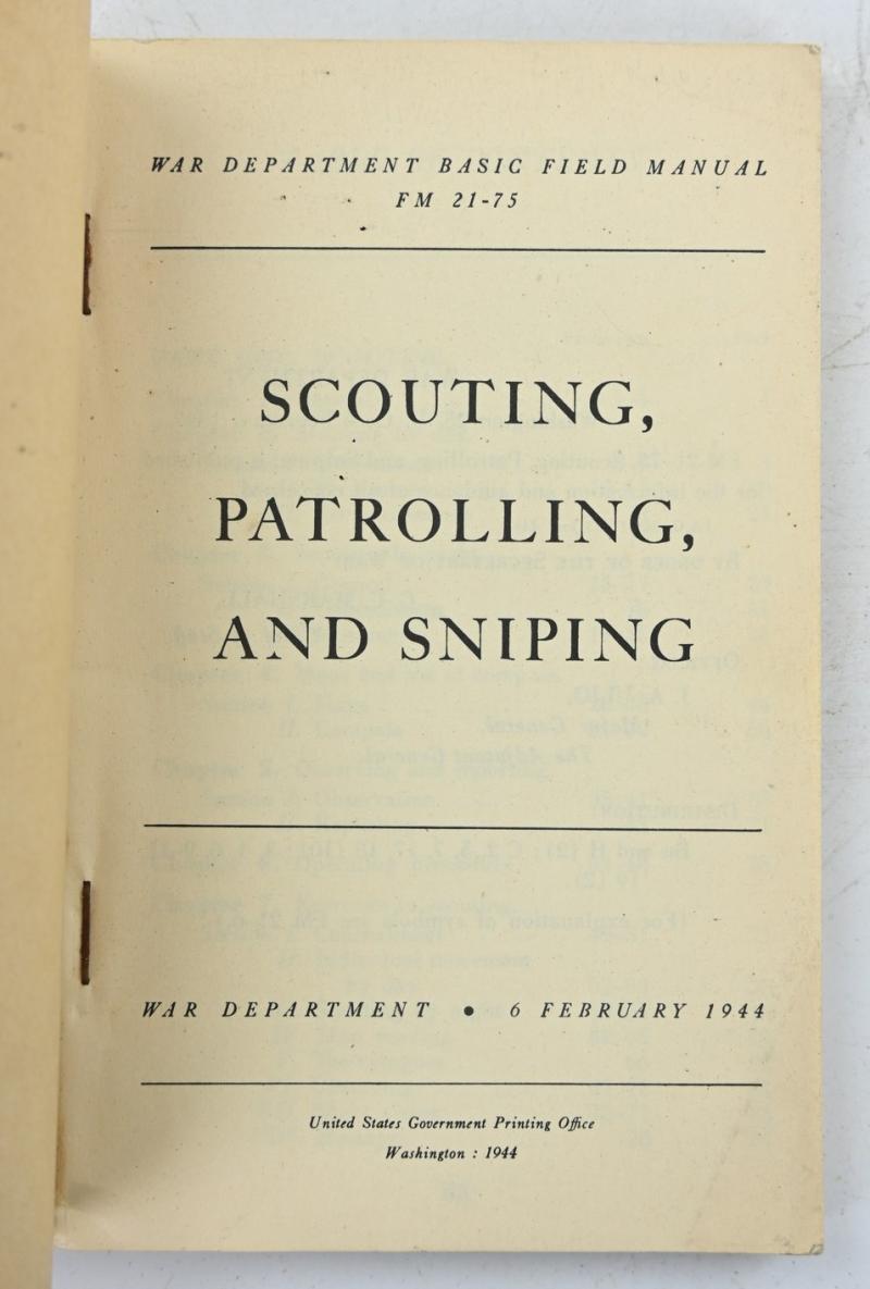In a very good condition a US WW2 Field Manual FM21-75 Scouting, Patrolling and Sniping The manual is dated 6 February 1944. A very stunning field manual!