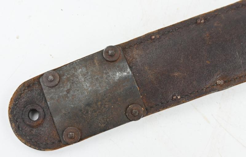 The top part of the leather scabbard has a cut-out belt attachment and can only be used as a legstrap version because of that. The cut is in our opinion wartime done to remove the metal belt attachment for leg use.
