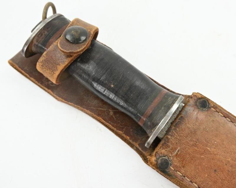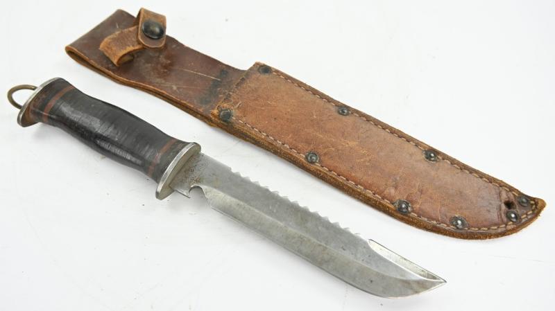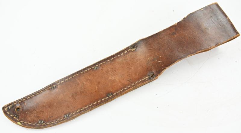 These knives were very popular among USGIs during WWII due to their versatility. While not official U.S. issue, private purchase knives were extremely common. Multiple variations were made with both wood and leather handles (see page 165 of U.S. Military Knives Collector's Guide By Silvey & Boyd). This example has a stacked leather handle, similar to many other military knives of the period. Overall length of the knife is 11 inches, with a 6 1/2 inch "bowie" blade, which has both a sawback and a bottle opener, making it a true survival tool.