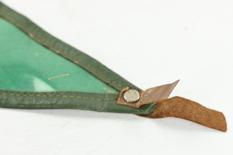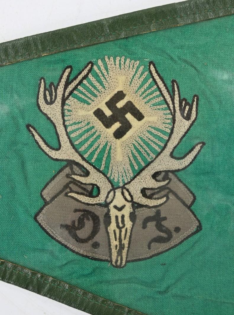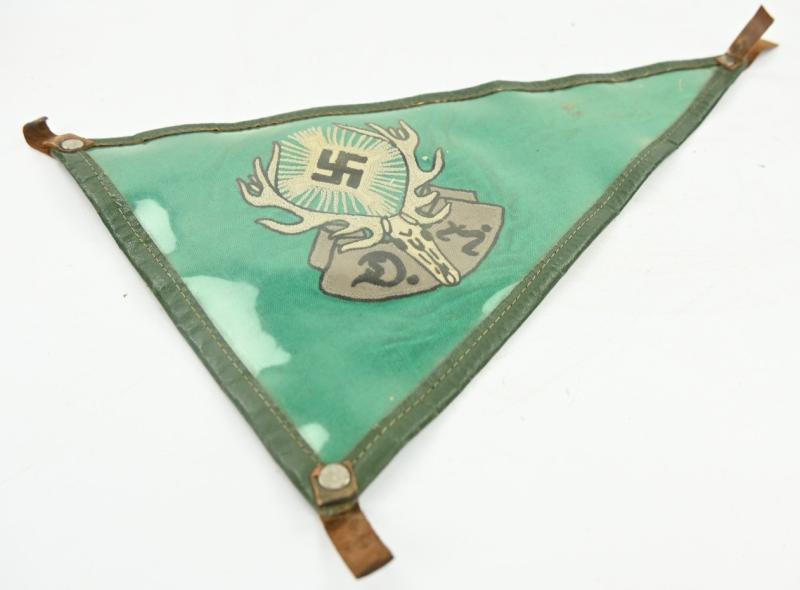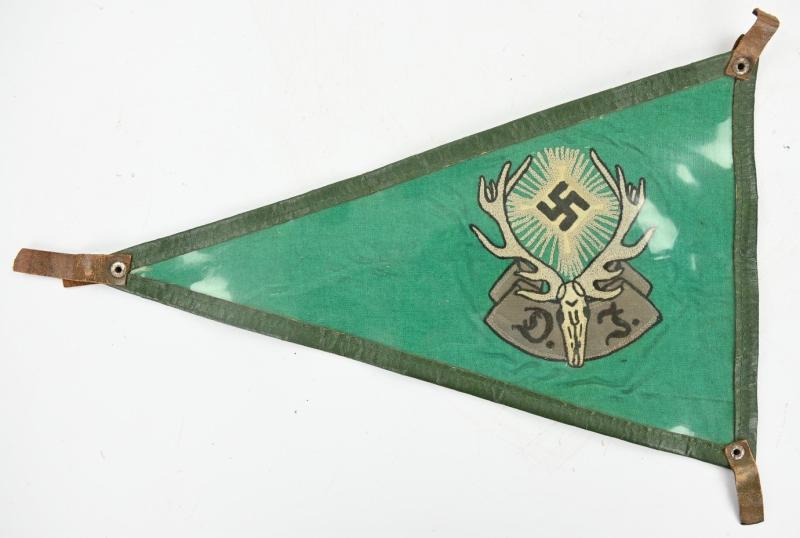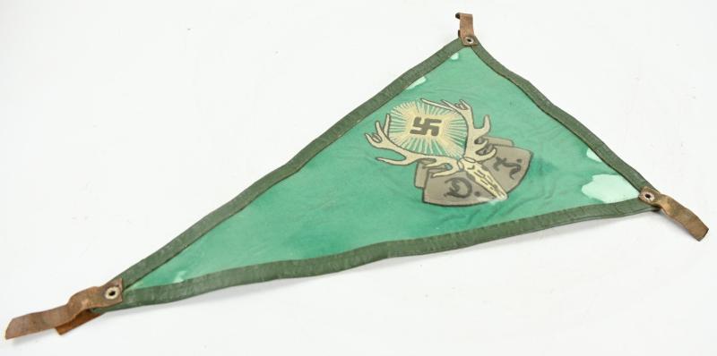 In a very good condition a German 'Deutsche Jägerschaft' (German Hunting Association) Pennant. The double-sided pennant is sized approximately 29 x 19 cms and comes with the rain cover in a good condition. Sadly the corner leathers are damaged but great and rare item for display!