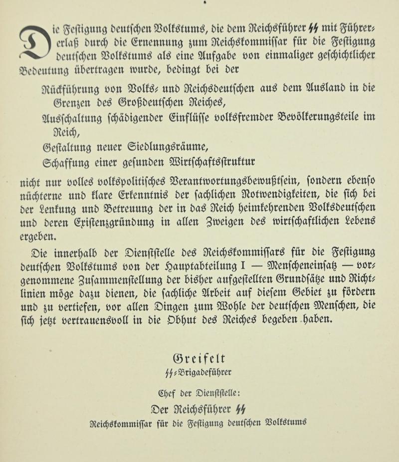 The book is written by SS-Brigadeführer Greifelt as German Chief of Staff for the Reich Commissioner for the Consolidation of German Nationhood