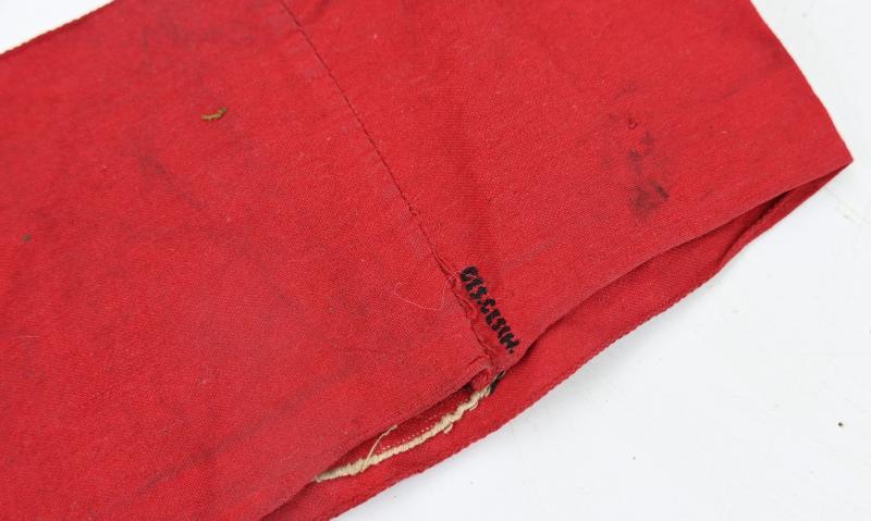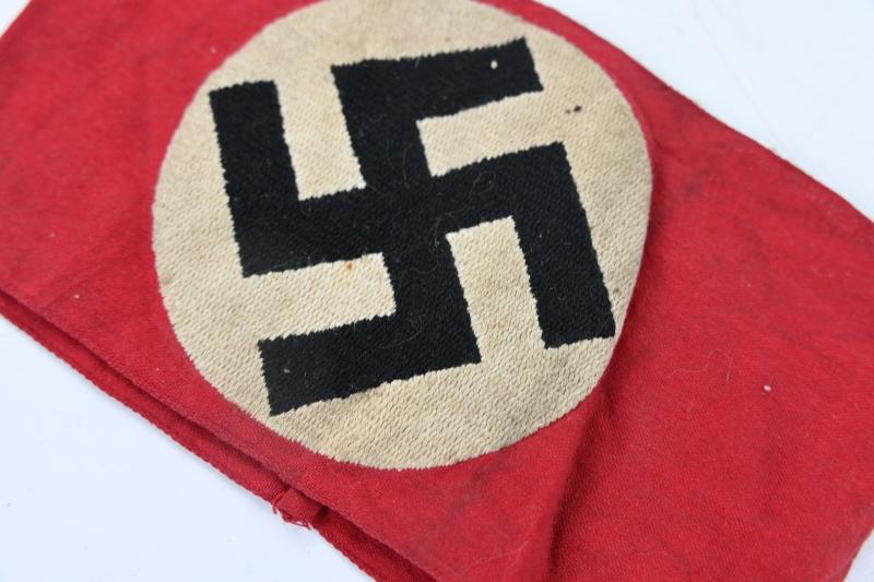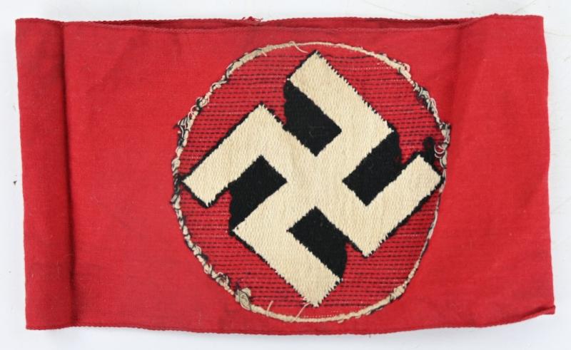In a nice used condition a German NSDAP Armband. The armband comes in red linnen base with a black BEVO weave pattern sewn swastika in an also white woven centre! A harder to find armband!
