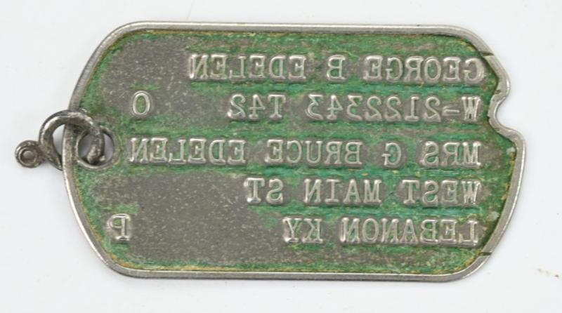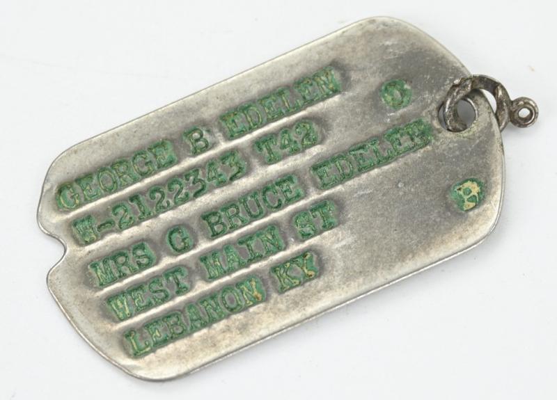 In a very nice used condition a US Army Air Force Dog-Tag on the name of 'George B. Edelen'. George was a member of the 10th Army Air Force Squadron E accourding our research. A very nice dogtag!