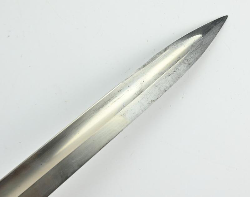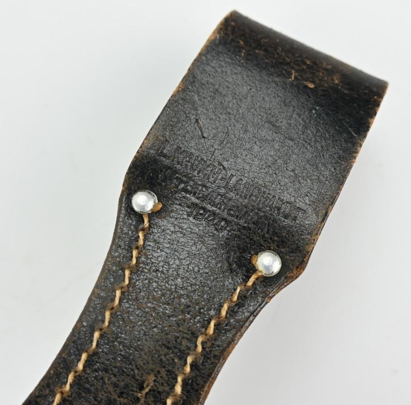 The bayonet comes with a black leather scabbard and has also a black leather frog attached from the company of L. Krumm & Langhardt from Offenbach am Main and is dated 1940.