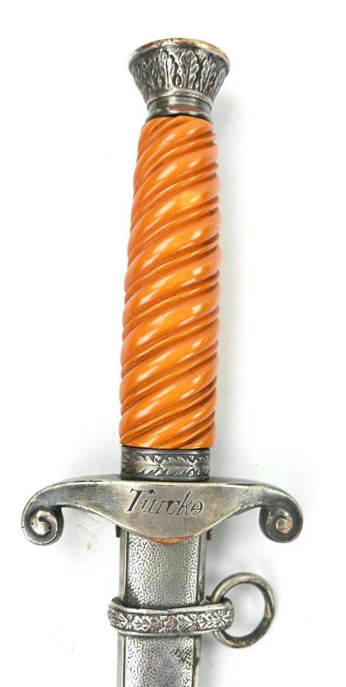 The lower crossguard comes with the name of the former officer ingraved in the crossguard 'Turcke'.
