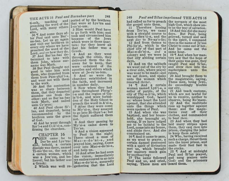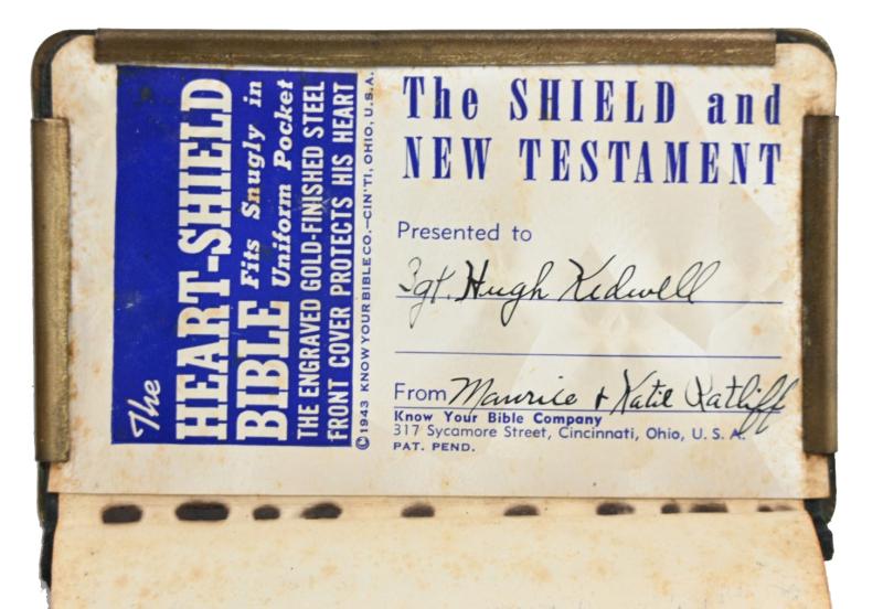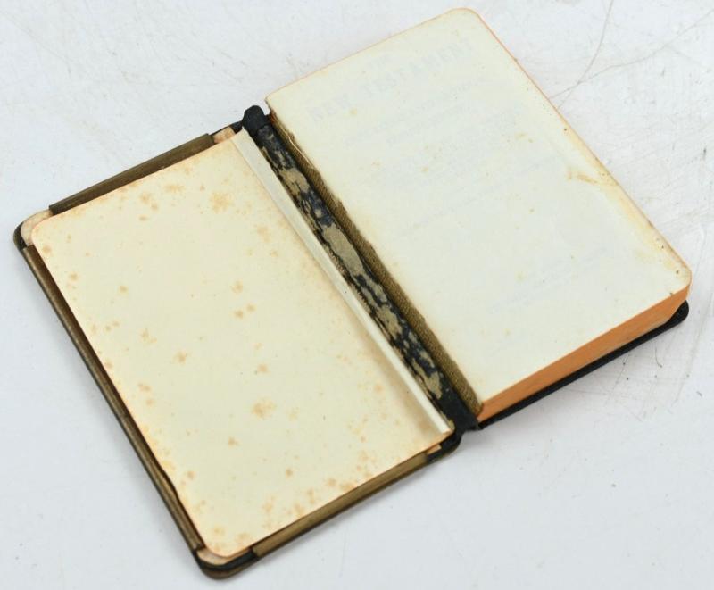 In a very good condition a US WW2 Shield Bible / New Testament. The bible comes with the name of the one presented to Sgt. Hugh Kidwell and has on the cover the text 'May god bless you'. A very good example!