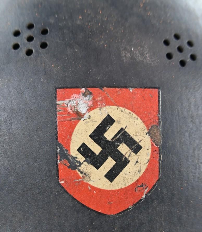 The left decal of the M34 helmet features a German National Eagle clutching an oak-wreathed canted swastika in silver, within a black shield and thin silver border. The right decal of the helmet features the NSDAP emblem a black mobile swastika with a white disk within a red shield. Both decals are fully intact and in good condition.