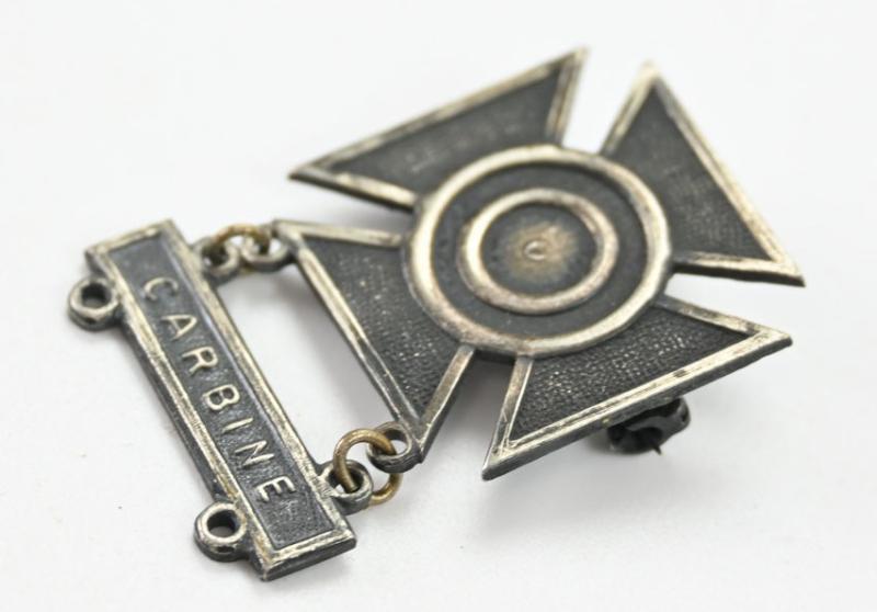 In a very nice condition a US WW2 Sterling Silver Marksman Sharpshooter Badge. The badge comes with the 'Carbine' qualification bar attached.