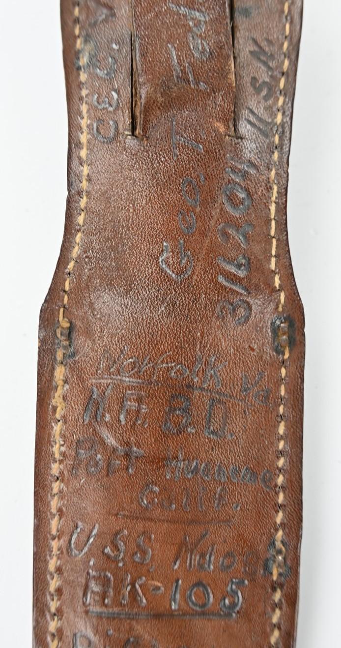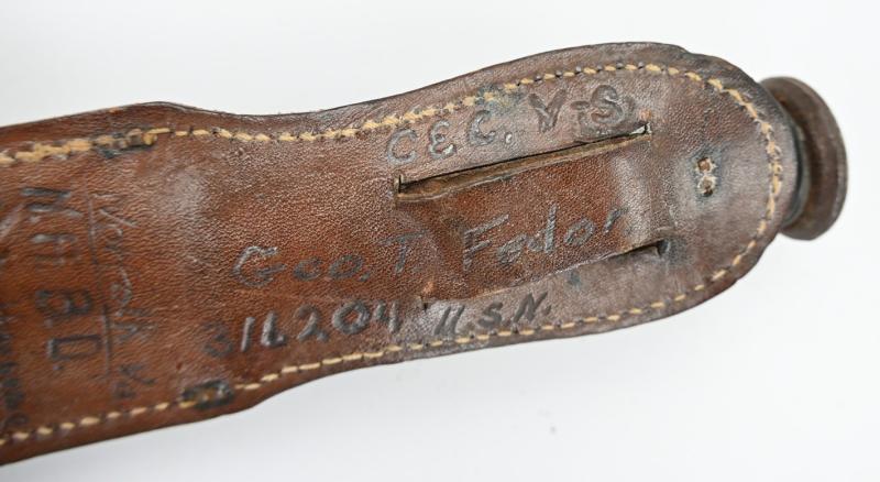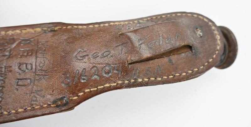 The knife comes with a complete marked leather scabbard on the name of USN member Geo T. Fedor, employee on the USS Naos AK-105.