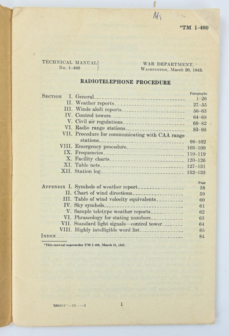 In a very nice condition a US WW2 Army Air Force Technical Manual TM 1-460 'Radiotelephone Procedure'. The book is dated March 1943 and comes in a complete condition!
