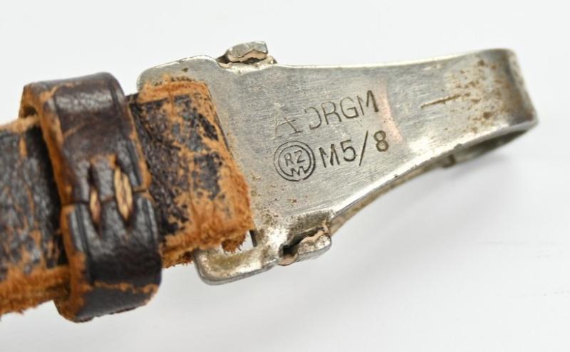 In a very nice condition a German SA Sturmabteilung Dagger Hanger. The hanger is nicely maker marked on the clip and inside the leather. Sadly the leather strap is damaged. Still a very nice example.