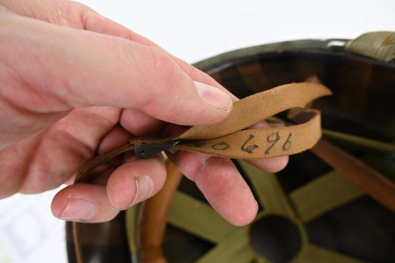 The wartime helmet shell has a not visible heatnumber due to use and has the chinstraps still attached.