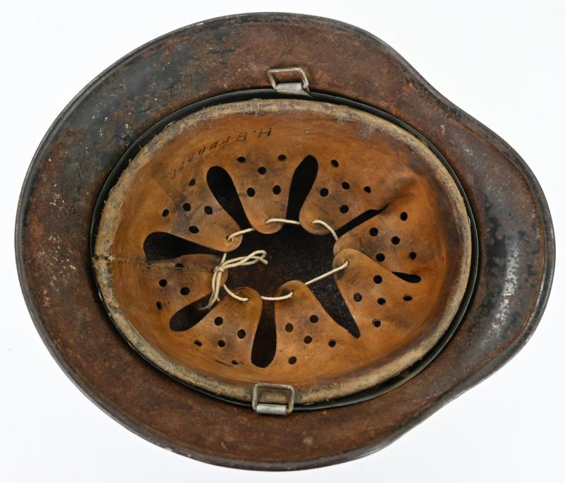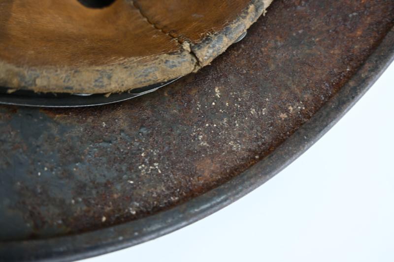 The helmet has a not visible maker marking and productionnumber because of traces of rust on the inside of the shell.