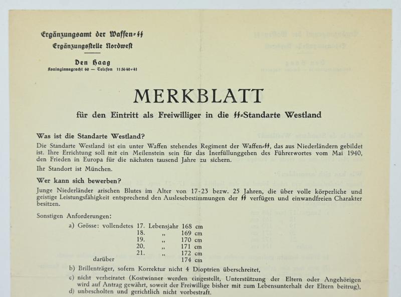 In a very good condition and hard to find a Dutch Waffen-SS Recruitment Form for the SS Standarte Westland. The form comes in a very good condition. A stunning item for display!