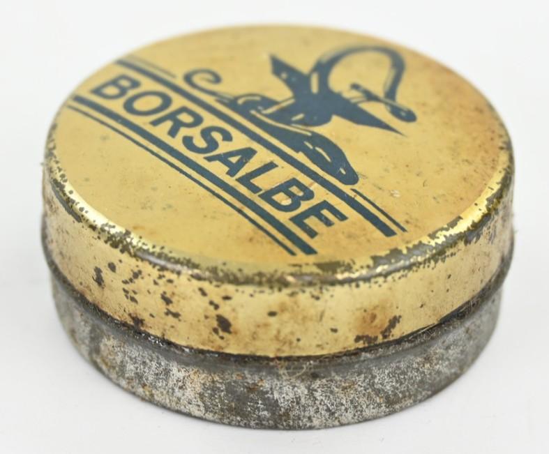 In a very good condition a German Wehrmacht Tin can of 'Borsalbe'. The tube comes without the original content. A very hard to find package!
