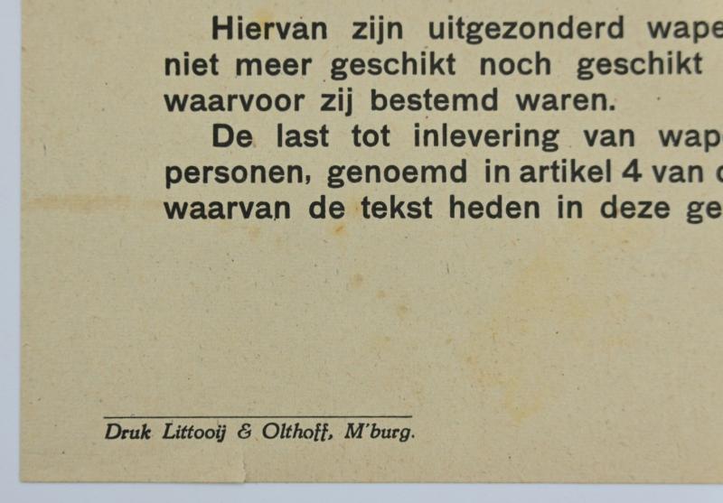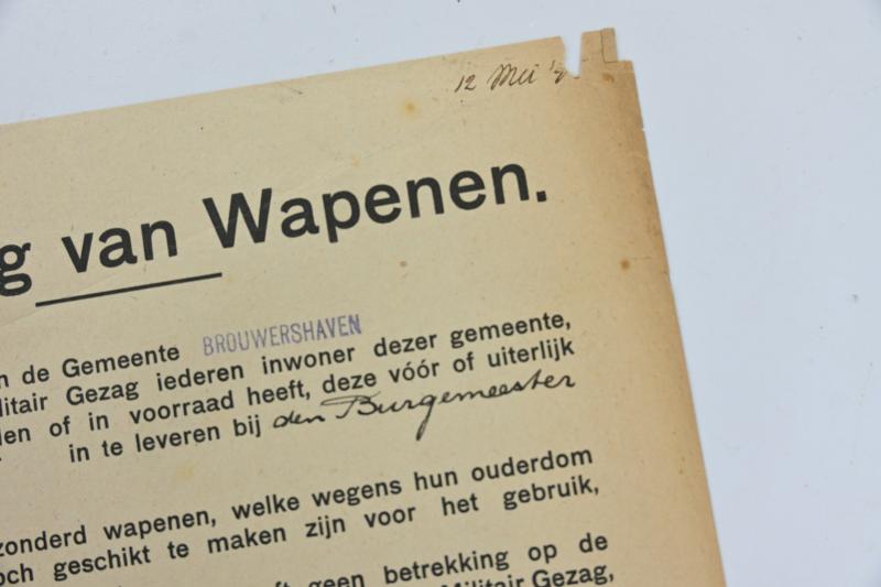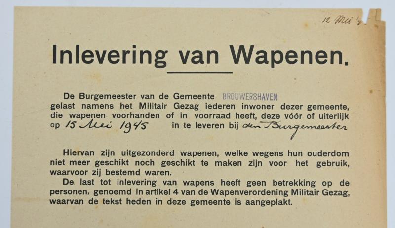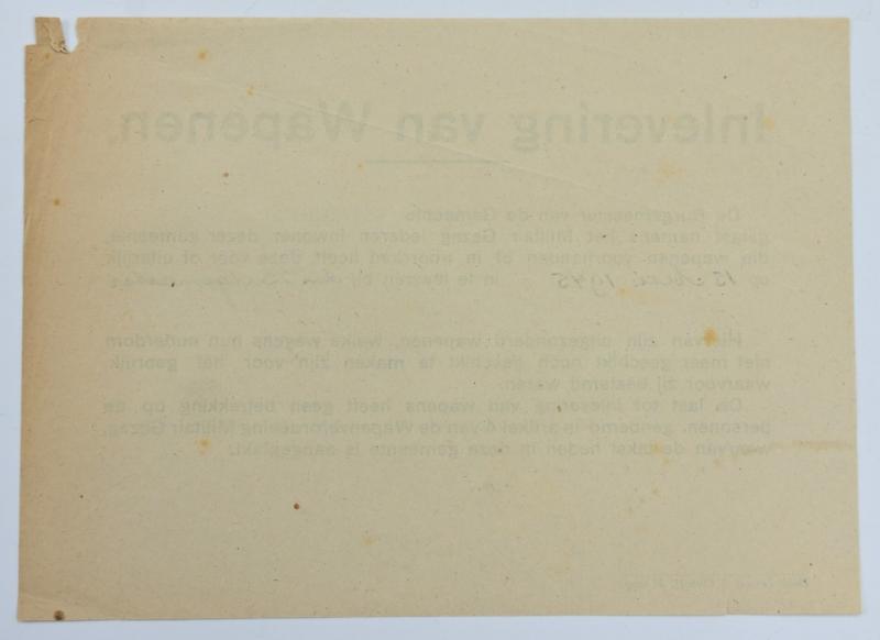 In a very nice condition a Dutch WW2 Notice /Flyer 'Surrendering of weapons'. The flyer is addressed to the Dutch Citizen of the town of Brouwershaven and is dated May 1945.