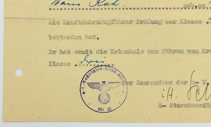 In a very nice condition a SS-Totenkopf Drivers License Certificate KFZ. The ceritifcate is dated 1940.