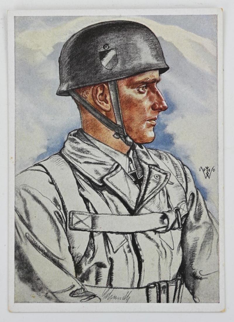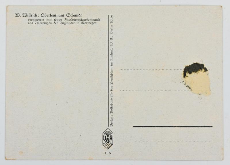 In a very good condition a German Luftwaffe Fallschirmjager Postcard of Oberleutnant Schmidt. The postcard is form the W.Willrich serie.