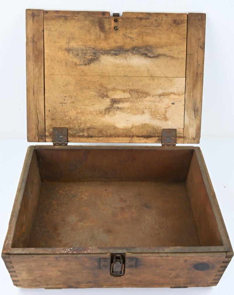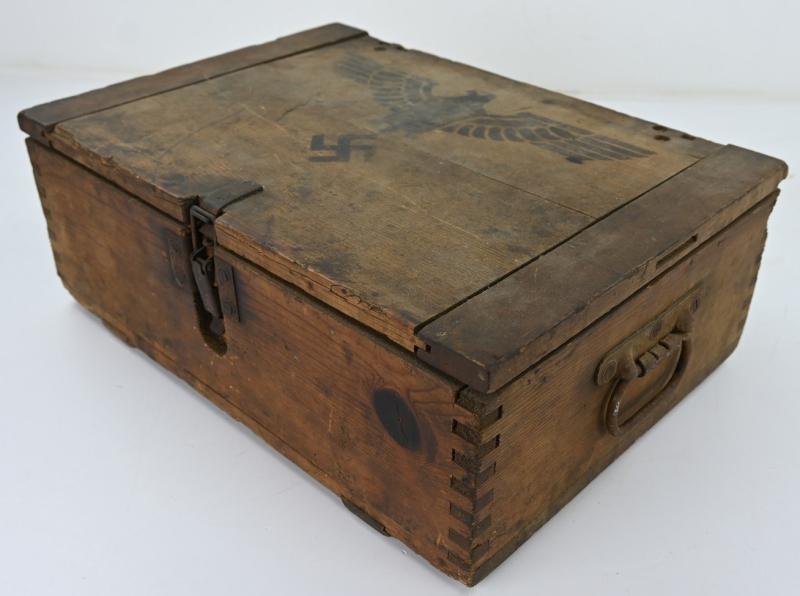 In a very good condition a stunning German Wehrmacht (Heer) Ammunition box. The wooden box comes with a stunning eagle with swastika on top. A very stunning item for display!
