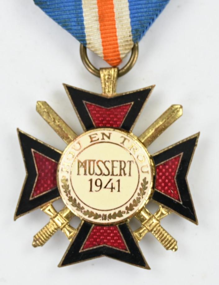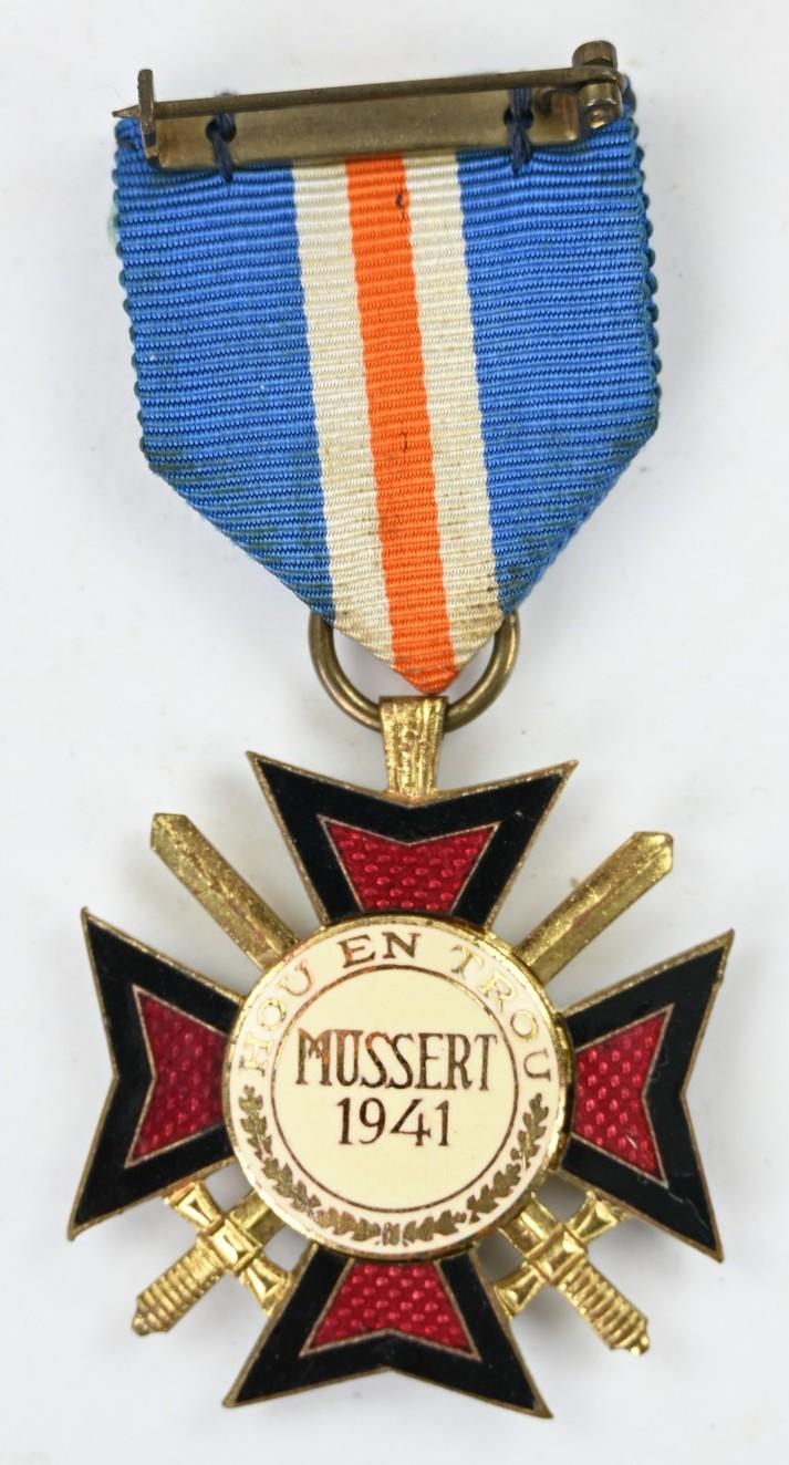 The Mussert Cross was instituted as a decoration to be awarded to NSB members in German service who had taken part in the campaign against Russia. The medals are never officially awarded because they were not approved by the German command. On front the Swastika and Wolfshook are shown, the back carries the text 'Hou en Trou' and 'Mussert 1941'. The medal is in good condition and complete with its original confectioned ribbon and matching batton, the set comes in its original, regrettably damaged carton box. The box is showing some damage like mostly when found.