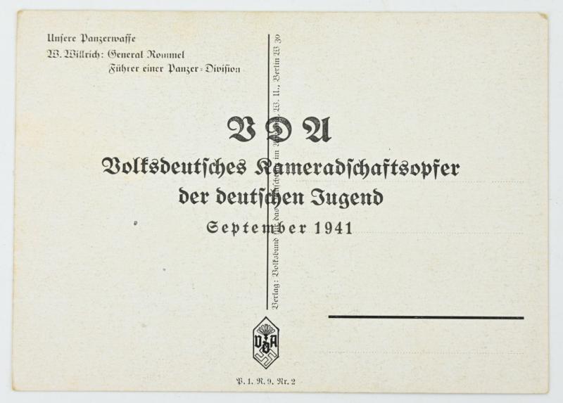 In a very good condition a German Wehrmacht (Heer) Postcard of Generaloberst Rommel. The postcard is form the W.Willrich serie Unsere Panzerwaffe.