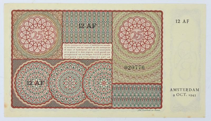 In a near mint condition a stunning Dutch WW2 Period Banknote of 25 Guldens. The bankniote is dated 1943 and was scarce issued!