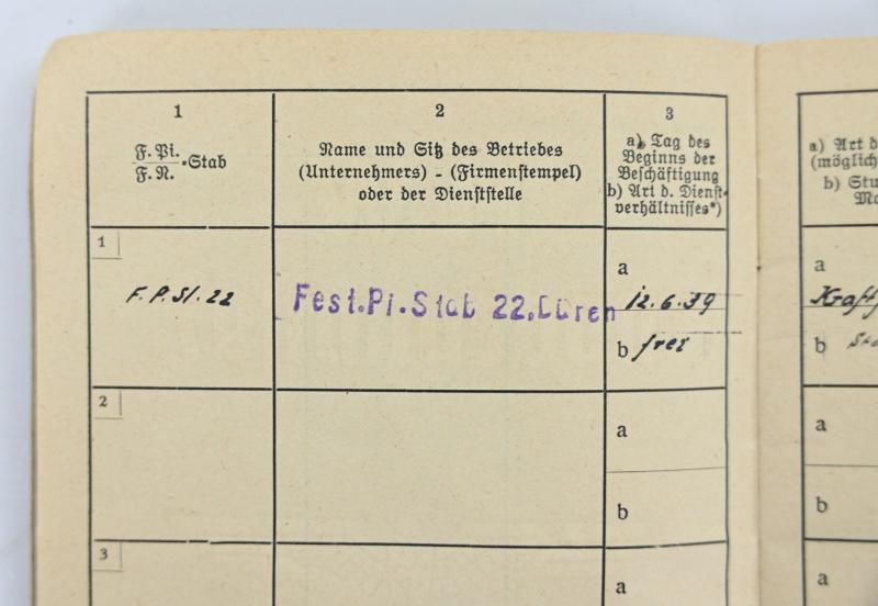 The 'WH Festungsbau' was a part of 'Organisation Todt'. The booklet was issued on 23 May 1942 to a member of the 'Festungs-Pionierstab 22', the booklet is complete with portrait-photo. Only a few entries have been made. Nice example in good used condition!