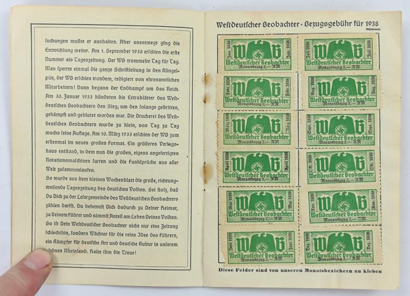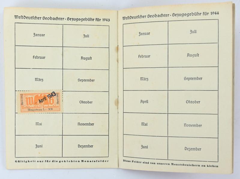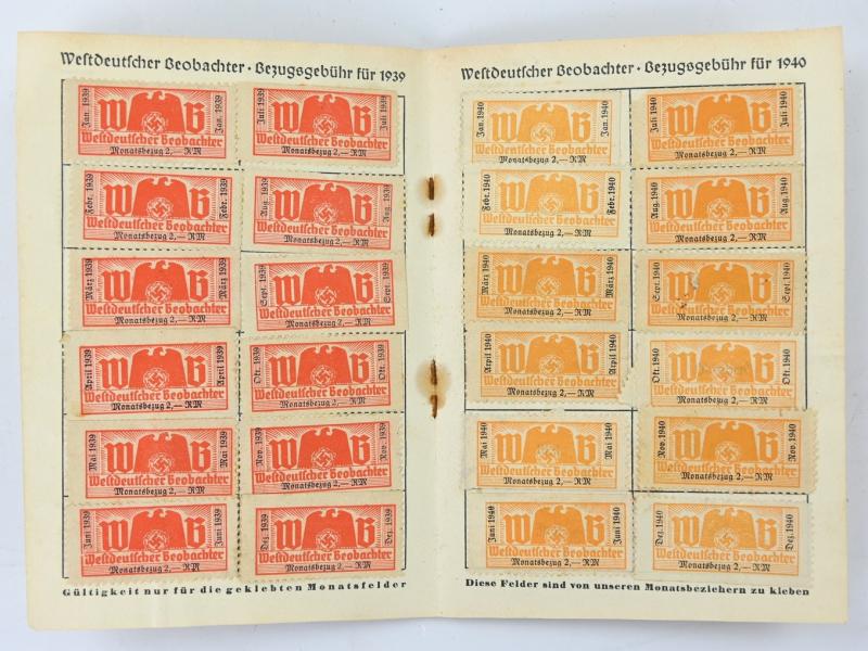 In a very nice condition a German Westdeutsche Beobachter Payment Booklet. The booklet is full of stamps from 1938 till 1943.