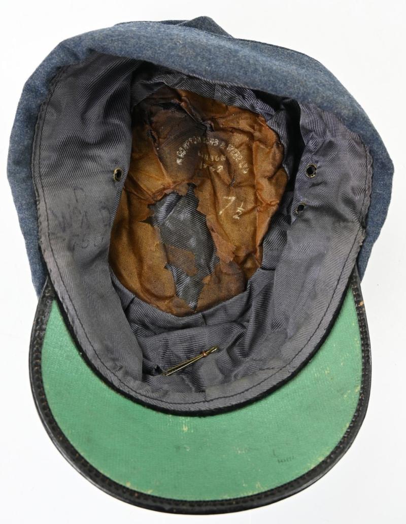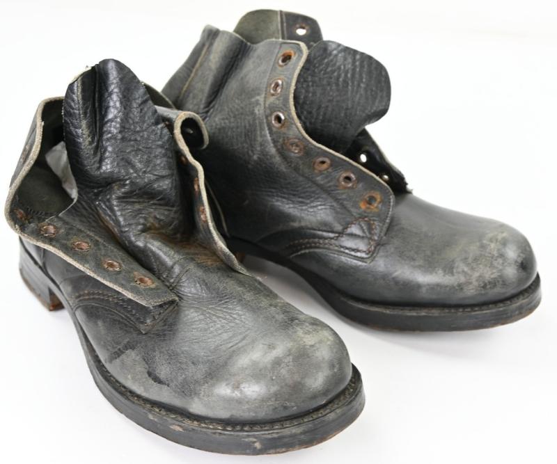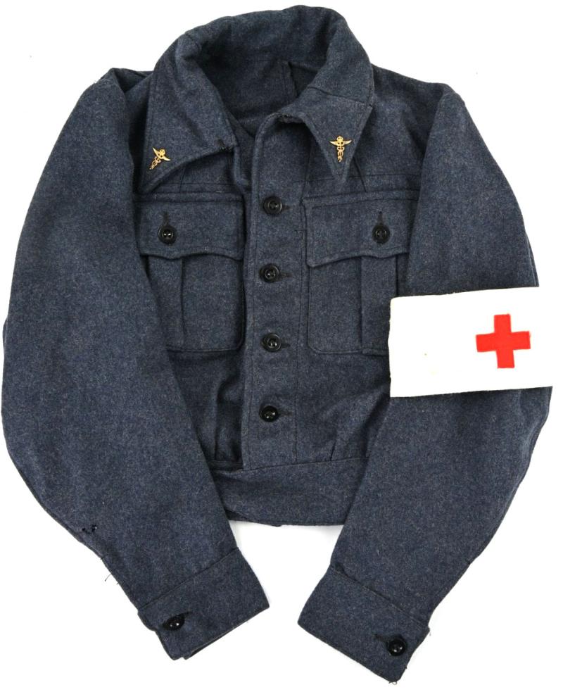 The grouping contains the cap with badge dated 1942 and comes in size 7,5''. A stunning brody helmet in the original RAF blue paint, a pair of 1945 dated small size boots, battledress size 6 dated 1945 with red cross armband and a pair of battledress trousers in size 2 and dated 1944.