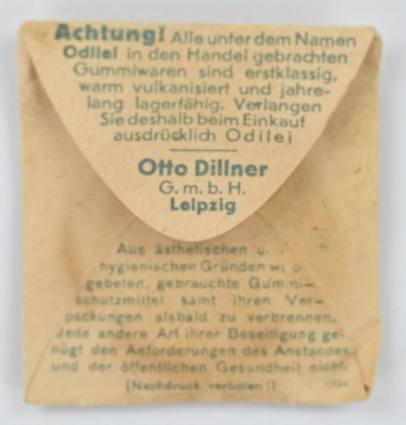 In a very good condition a German Wehrmacht package of 'Odilei' Condom in original paper package. The condom was produced by the company of 'Otto Dillner G.m.b.H.', based in Leipzig. Rare and hard to find item, great for completing a personal kit display.
