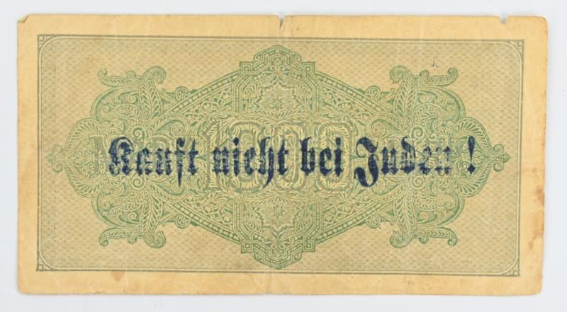 In a very nice condition a very rare to find Third Reich era banknote. The 1000 Mark banknote is overprinted by the SA (sturmabteilung) with an anti-semitic propaganda overprint.