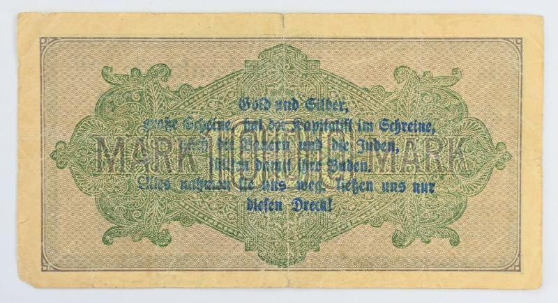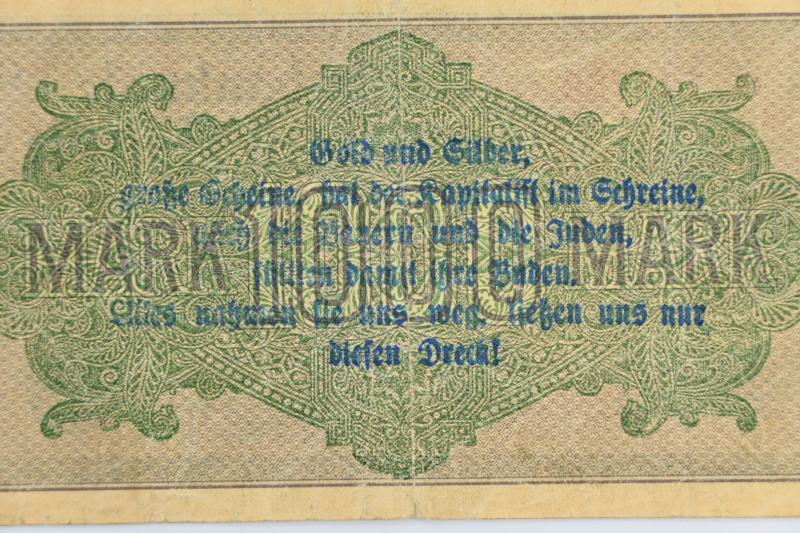 In a very nice condition a very rare to find Third Reich era banknote. The 1000 Mark banknote is overprinted by the SA (sturmabteilung) with an anti-semitic propaganda overprint.