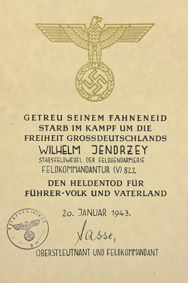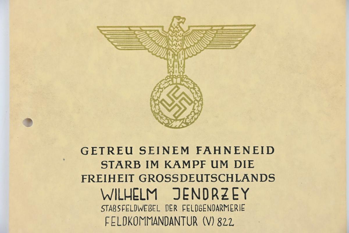 In a very good condition a hard to find certificate of teh death of Stabsfeldwebel der Feldgendarmerie Wlhelm Jendrzey member of feldkommandatur (V) 822.