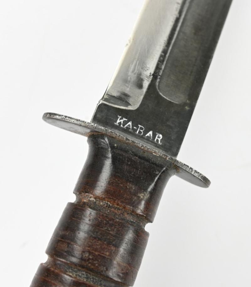 In a very good condition a US Navy WW2 Ka-Bar Fighting Knife. The knife is nicely KABAR marked and comes with the original scabbard. Sadly the snap button is broken.