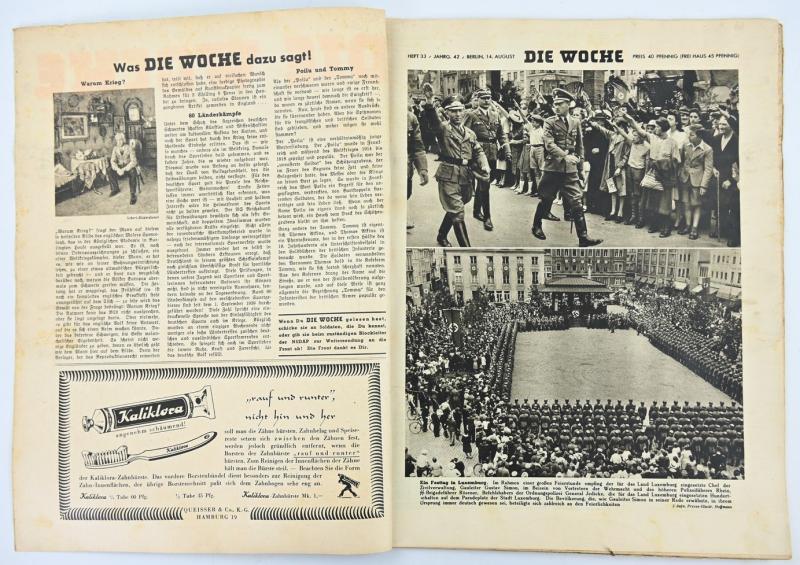 In a very nice condition a German Third Reich Magazine 'Die Woche'. The magazine is dated August 1940 and comes with a stunning colour printed cover.