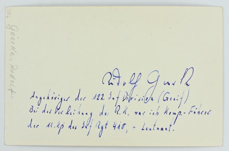 In a very good condition a original Signature on a postwar portrait picture of Wehrmacht Heer KC Recipient 'Rudolf Goerke'.